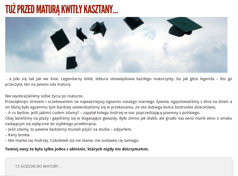 Nie wszyscy korzystają z Facebooka, a wśród tych nie wszystkich jest pewnie kilku maturzystów (którym chętnie zadałbym pytanie, ile błędów widzicie w tym zdaniu), dlatego im dziś dedykuję pewien tekst, który co roku o tej porze odżywa, przechodząc od jednego maturzysty do drugiego. W ciągu pół godziny od wrzucenia linka na Facebooka przeczytało go ponad 2 tysiące osób.